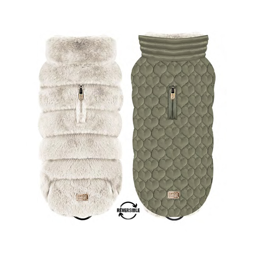 Obojstranná bunda, z jednej strany vodeodolný prešívaný polyester, z druhej strany jemná, mäkká kožušinka. S elastikou na chvost