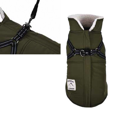 Vatovaná bunda s integrovaným popruhom a reflexným popruhom. Zapínanie na zips na zadnej strane. Rebrované zakončenie.