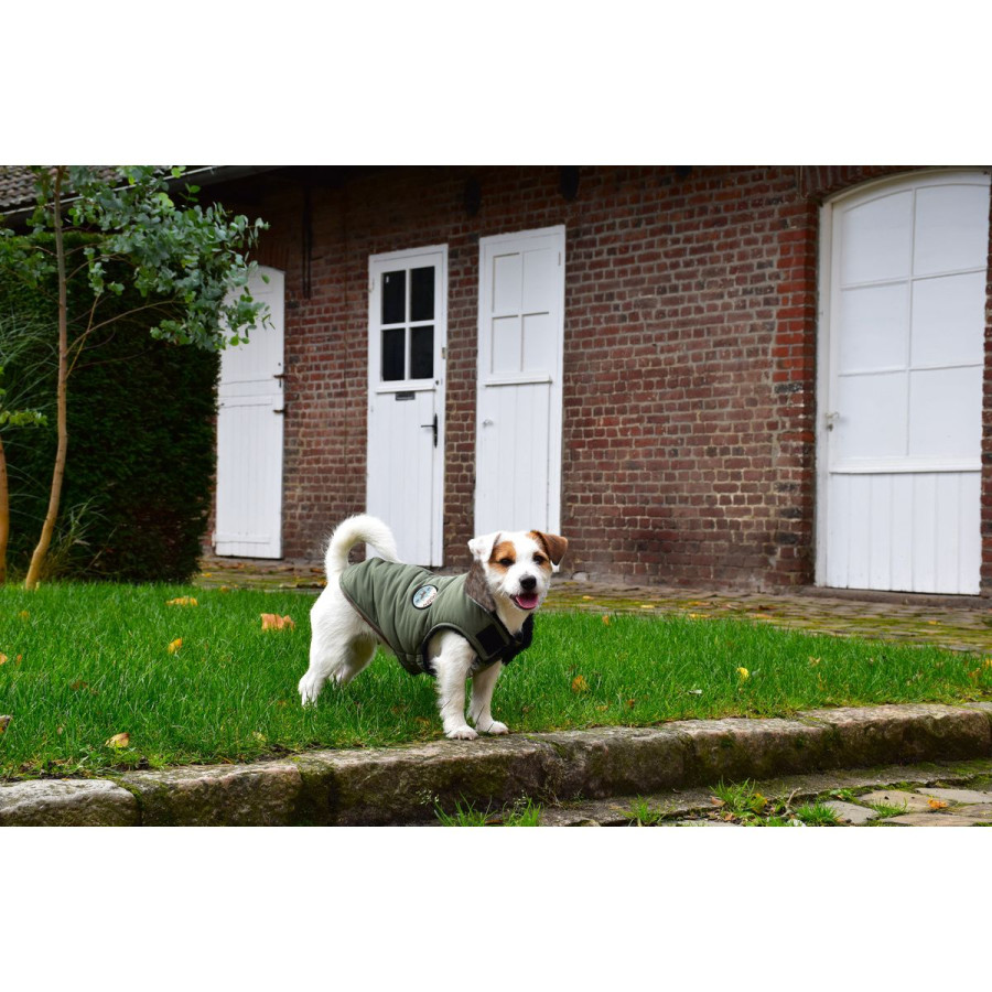 Páperová bunda podšitá umelou kožušinou s odnímateľnou kapucňou, zdobená vyšívanou nášivkou a vybavená vreckom na vloženie GPS.