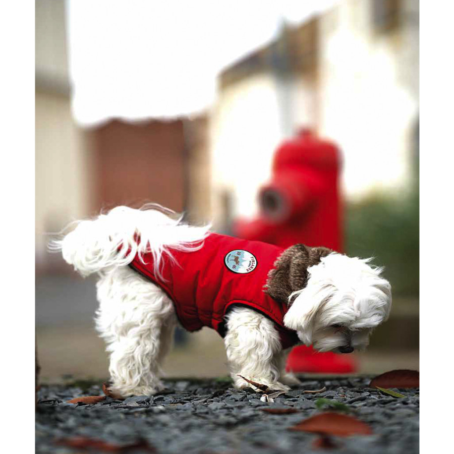 Páperová bunda podšitá umelou kožušinou s odnímateľnou kapucňou, zdobená vyšívanou nášivkou a vybavená vreckom na vloženie GPS.