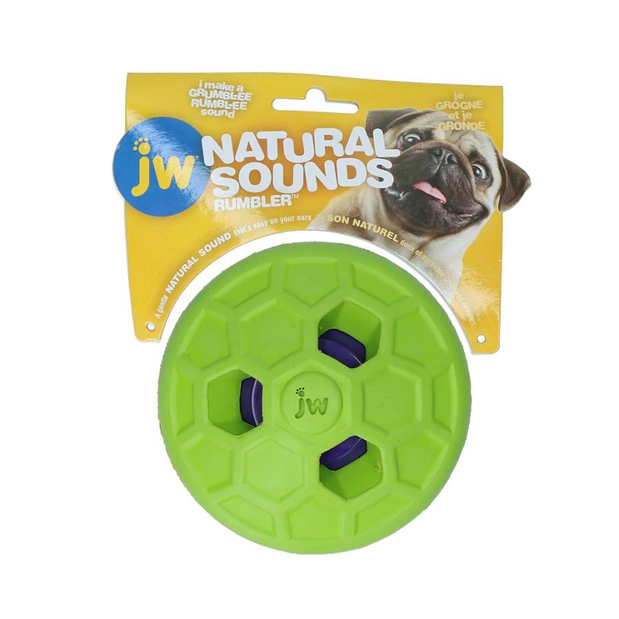 Tento zábavný rumbler JW Natural Sounds je zábavou pre majiteľa aj psa! Hračka z mäkkej gumy vydáva pri hraní zábavné prírodné zvuky, ktoré však nie sú také hlasné, aby dráždili. Zvuk je ako dunenie, ktoré je inšpirované prírodou. Pretože má Rumbler okrúhly tvar, neustále sa hojdá, kolíše a otáča, vďaka čomu sa váš pes bude hrať! Mäkký materiál je príjemný v ústach a je tiež veľmi pevný.