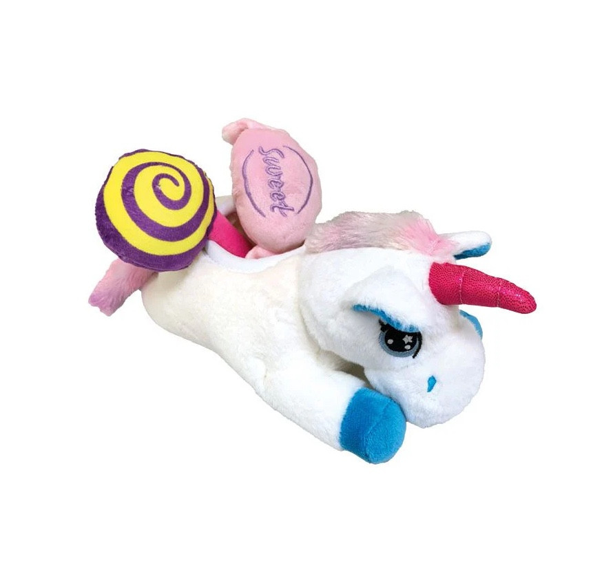 Na zadnej strane jednorožca je vrecko, v ktorom sú mäkké plyšové sladkosti, ktoré si váš maznáčik s radosťou vyberie.
