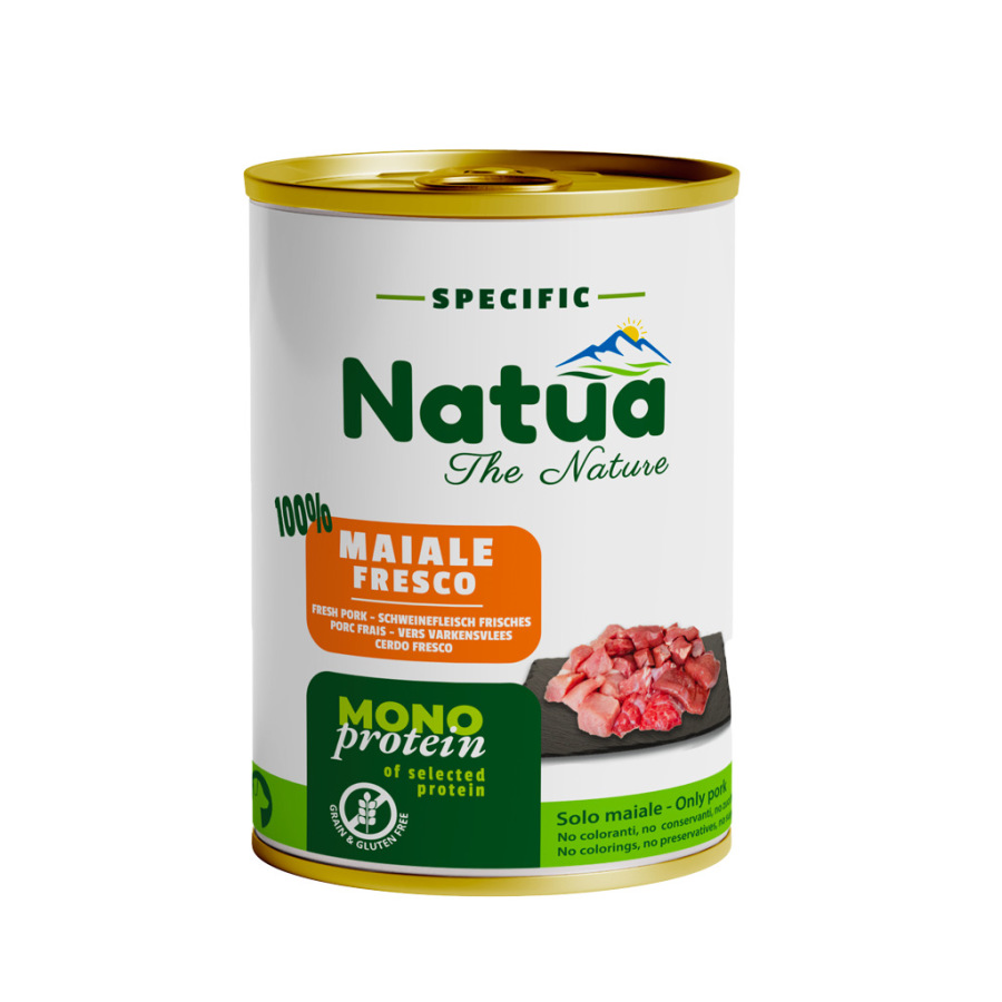 Jeden zdroj živočíšnych bielkovín: ideálne pre citlivé psy Recept bez obilnín a lepku Jemne dusené pre zachovanie živín 100 % prírodné, bez umelých prísad Výživné mokré krmivo s monoproteínmi od Natua Natua Specific je kompletné, prírodné mokré krmivo pre psov iba s jedným zdrojom živočíšnych bielkovín. Tieto chutné monoproteínové jedlá sú jemne dusené a vyrobené z vysoko kvalitných kusov mäsa, ako sú svalovina, pečeň alebo srdce. Recepty bez obilnín a lepku sú ideálne pre psy s alergiami alebo citlivým trávením. Vďaka svojej kompaktnej textúre toto krmivo obsahuje veľa mäsa a málo vlhkosti, čím poskytuje viac živín na porciu. KOMPLETNÉ KRMIVO PRE DOSPELÉ PSY Zloženie: čerstvé bravčové mäso 70 %, čo sa rovná 100 % použitého mäsa, bravčový vývar 28,9 %, minerály 1 %, ľanový olej 0,1 %. Prísady/kg: výživové doplnkové látky: 3a671 vitamín D3 200 IU, 3b605 monohydrát síranu zinočnatého 25 mg, 3b503 monohydrát síranu mangánatého 1,4 mg, 3b405 meď (pentahydrát síranu meďnatého) 0,5 mg. Analytické zložky: surový proteín 10,5 %, surový tuk 6,5 %, surový popol 2,3 %, surová vláknina 0,4 %, vlhkosť 77 %. Návod na použitie: viď tabuľka. Podávajte pri izbovej teplote. Po otvorení skladujte v chladničke a spotrebujte do 48 hodín. Minimálna trvanlivosť do: viď spodok balenia.