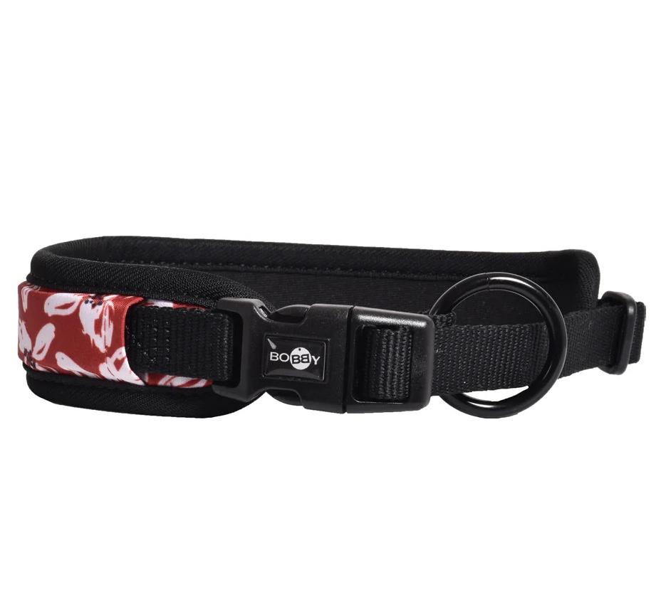 Polstrovaný obojok pre psa vyrobený z odolného a priedušného materiálu. Dostupné v dvoch farbách (oranžová a bordová), obe zdobené kvetinovým vzorom.