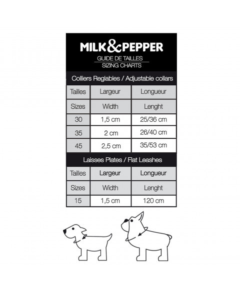 Veľkosť 25-36cm - Šírka 1,5cm (Čivavy/Yorkšíri...)Veľkosť 26-40cm - šírka 2cm (Jack russel /Spitz)Veľkosť 35-53 cm - šírka 2,5 cm (buldog, koker, bígl)Nastaviteľné obojky s exkluzívnou potlačouSpona v zlatej farbe (spona Boucle / D-krúžok)