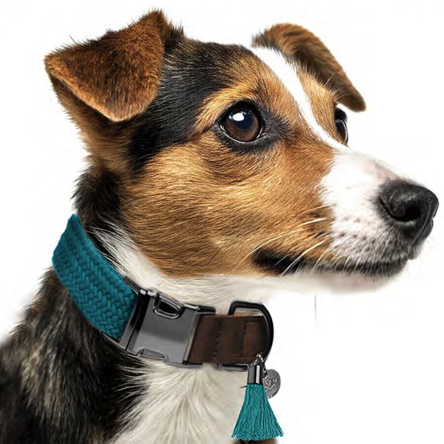 Nastaviteľný obojok zo spleteného vlákna s povrchovou úpravou v štýle vintage kože Kovové spony (spona/D-krúžok) Gravírovaná kovová medaila „M&P“.