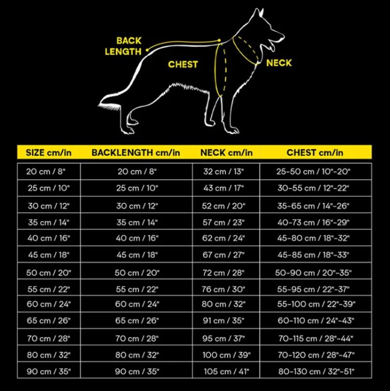 Povrchová látka je robustná, tichá a prispôsobuje sa pohybu psa. Reflexné detaily zvyšujú viditeľnosť vášho psa aj pri zlých svetelných podmienkach.Technický odev pre psov je dostupný v rôznych veľkostiach: S 25 cm, M 30 cm, L 35 cm, XL 40 cm, XXL 45 cm, 3XL 50 cm, 4XL 55 cm, 5XL 60 cm, 6XL 65 cm
