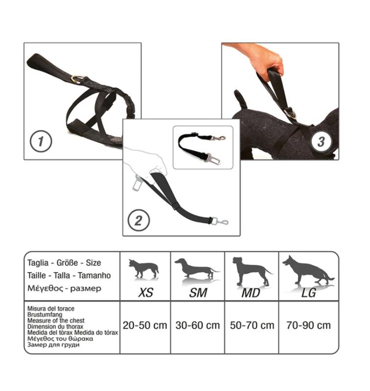 Postroj do auta je vybavený nastaviteľným popruhom s uchytením bežného bezpečnostného pásu a má aj karabínu na pripevnenie na akékoľvek vodítko, ktoré možno využiť aj na jednoduché prechádzky.