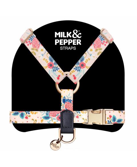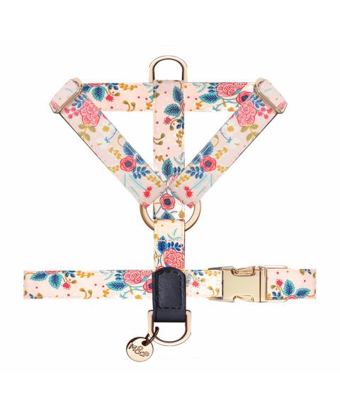 "H" nastaviteľné postroje vo svetloružovej farbe s viacfarebnou kvetinovou potlačou (exkluzívna potlač) a námorníckou modrou vintage imitáciou kože