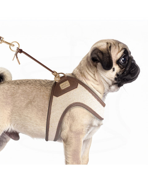 Postroje špeciálne navrhnuté pre malé a stredne veľké psy Vonkajšia strana z prírodnej tkanej látky (inšpirovanej ľanom) Podšívka z taupe interlocku Bočné záplaty a lemovanie z hnedej koženky Hnedé voskované bavlnené šnúrky Pracky a medailón zo zlatého kovu Plaketka „Milk&Pepper“ zo zlatého kovu