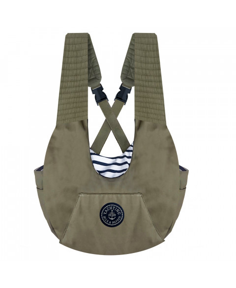 Predná taška „Baby Carrier“ z khaki gabardénu Podšívka z bieleho a námorníckeho pruhovaného interlocku Predné a bočné vrecká Odnímateľný a vystužený vankúš pre stabilitu psa Tkaný odznak „Yachting Milk & Pepper“ Malé nylonové vodítko s titánovou sponou Rozmery: 39x22 cm