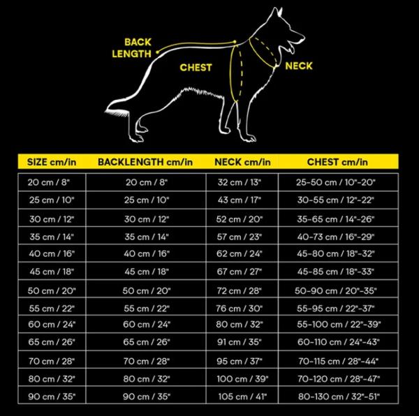 Pozor: veľkosť hlavy zodpovedá dĺžke chrbta psa od kohútika (stred lopatiek) po koreň chvosta.Technický odev pre psov je dostupný v rôznych veľkostiach: S 25 cm, M 30 cm, L 35 cm, XL 40 cm, XXL 45 cm, 3XL 50 cm, 4XL 55 cm, 5XL 60 cm, 6XL 65 cm