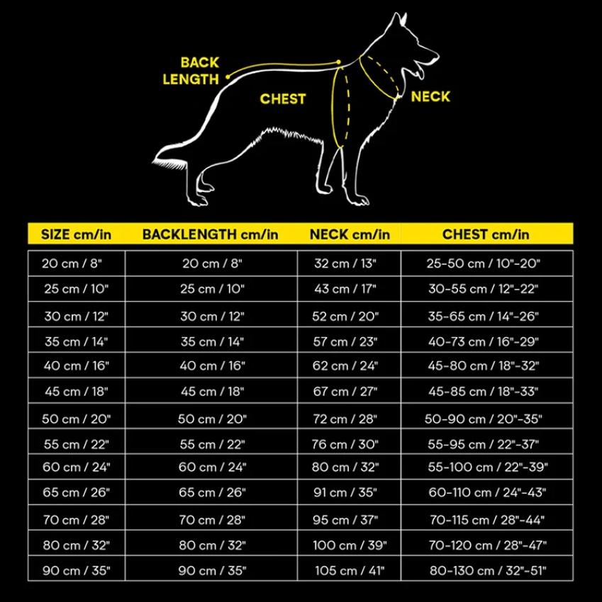 Technický odev pre psov je dostupný v rôznych veľkostiach: M 30 cm, L 35 cm, XL 40 cm, XXL 45 cm, 3XL 50 cm, 4XL 55 cm, 5XL 60 cm, 6XL 65 cm, 7XL 70 cm, 8XL 80 cm