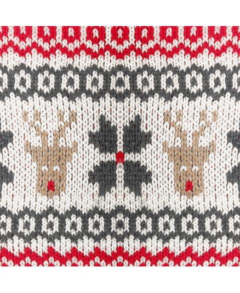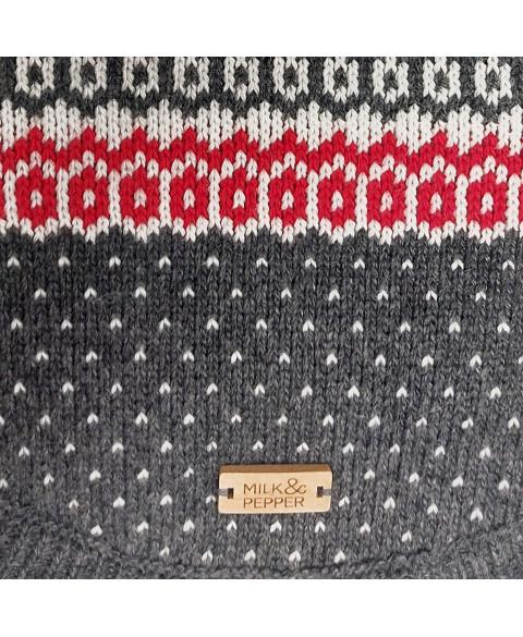 Antracitovo sivý/červený/sivobiely a šedohnedý žakárový sveter (v dizajne snehovej vločky a hlavy soba)