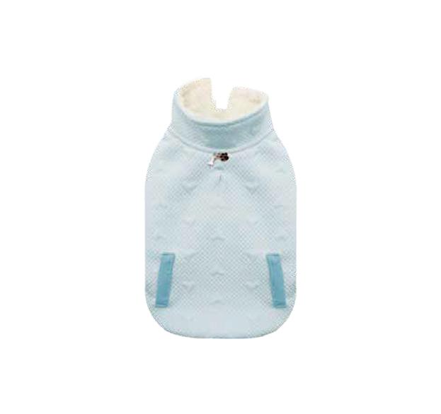 Bunda zo špeciálnej embosovanej látky so srdiečkovými motívmi, podšitá teplým plyšom. Kontrastné rebrované vrecká. Šperky na výstrihu.