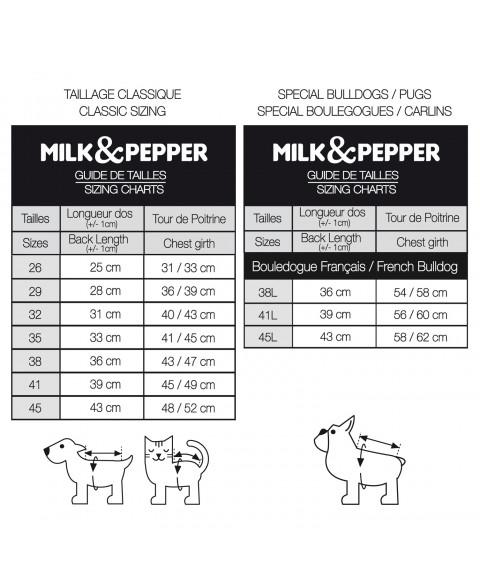Špinavobiely prúžok s malými gombíkmi bronzovej farby a antracitovou potlačou „Milk&Pepper“.