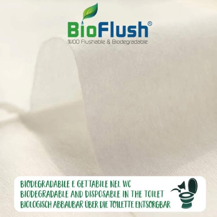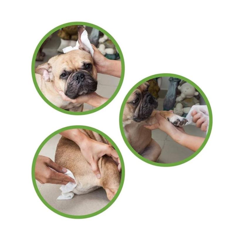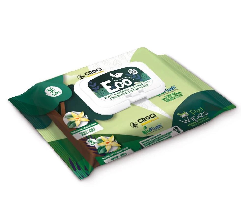 Všetky balenia utierok Eco Pet Wipes pre psov a mačky sa skladajú z čistiacich obrúskov vyrobených zo 100% biologicky rozložiteľnej látky, ktorú možno hodiť do toalety.
