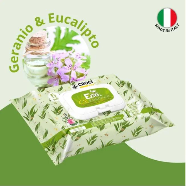 Balenie je vyrobené zo 100% recyklovateľného materiálu a obsahuje 15 prírodných utierok pre psov, dostupných v troch rôznych vôňach: Levanduľa, Geranium a Eukalyptus, Zázvor a Citrón.